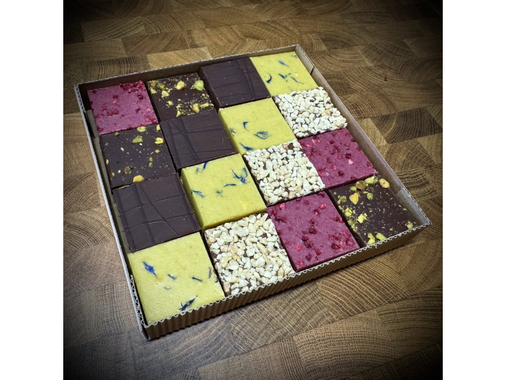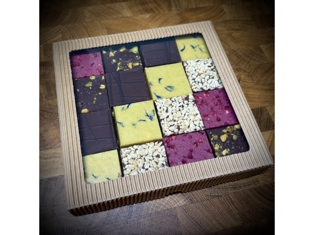 Korpus: datle, kakao, kakaové máslo, mandle, kešu, lískové ořechy, vanilka